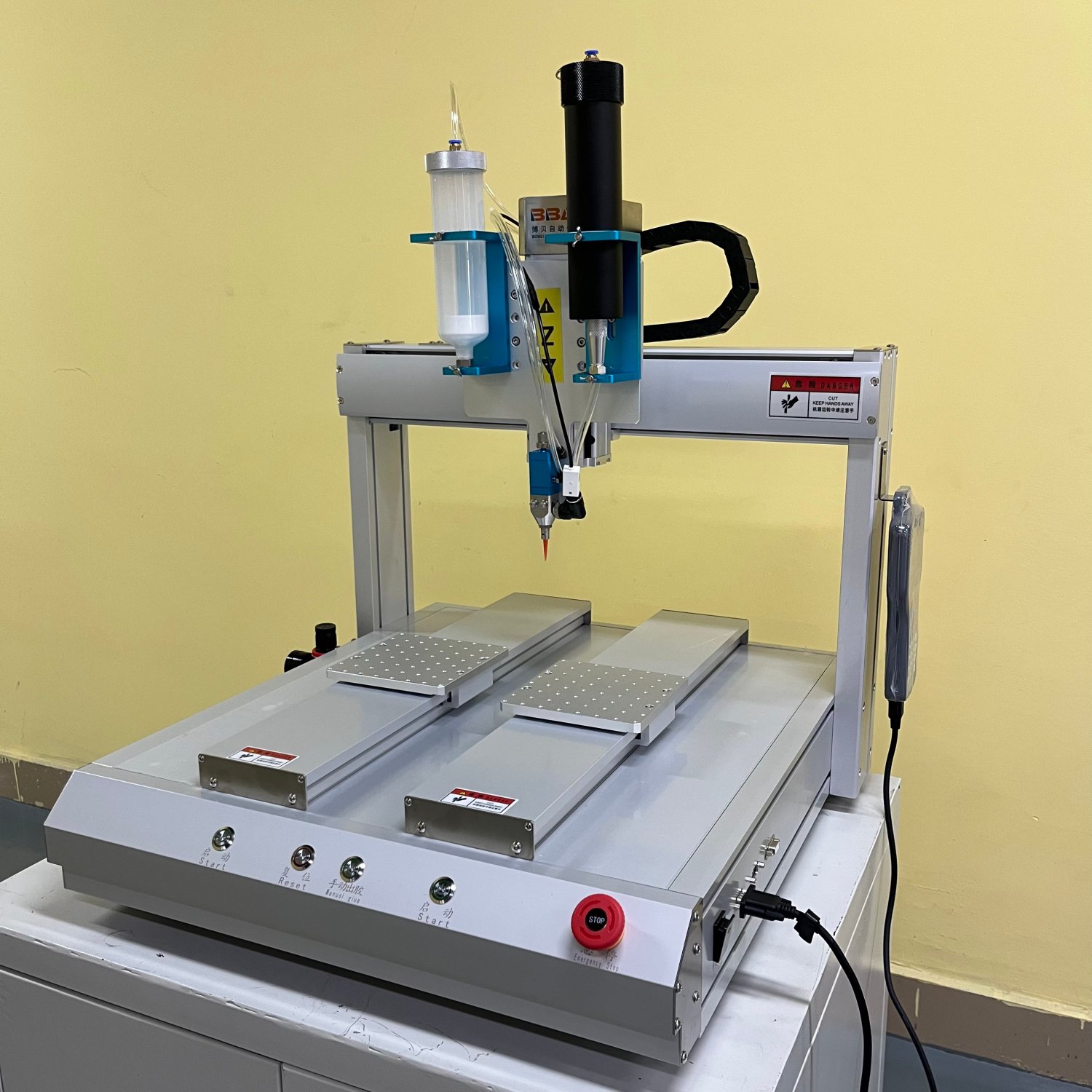 - Le robot distributeur de colle est contrôlé par un moteur pas à pas de haute précision pour garantir la précision.